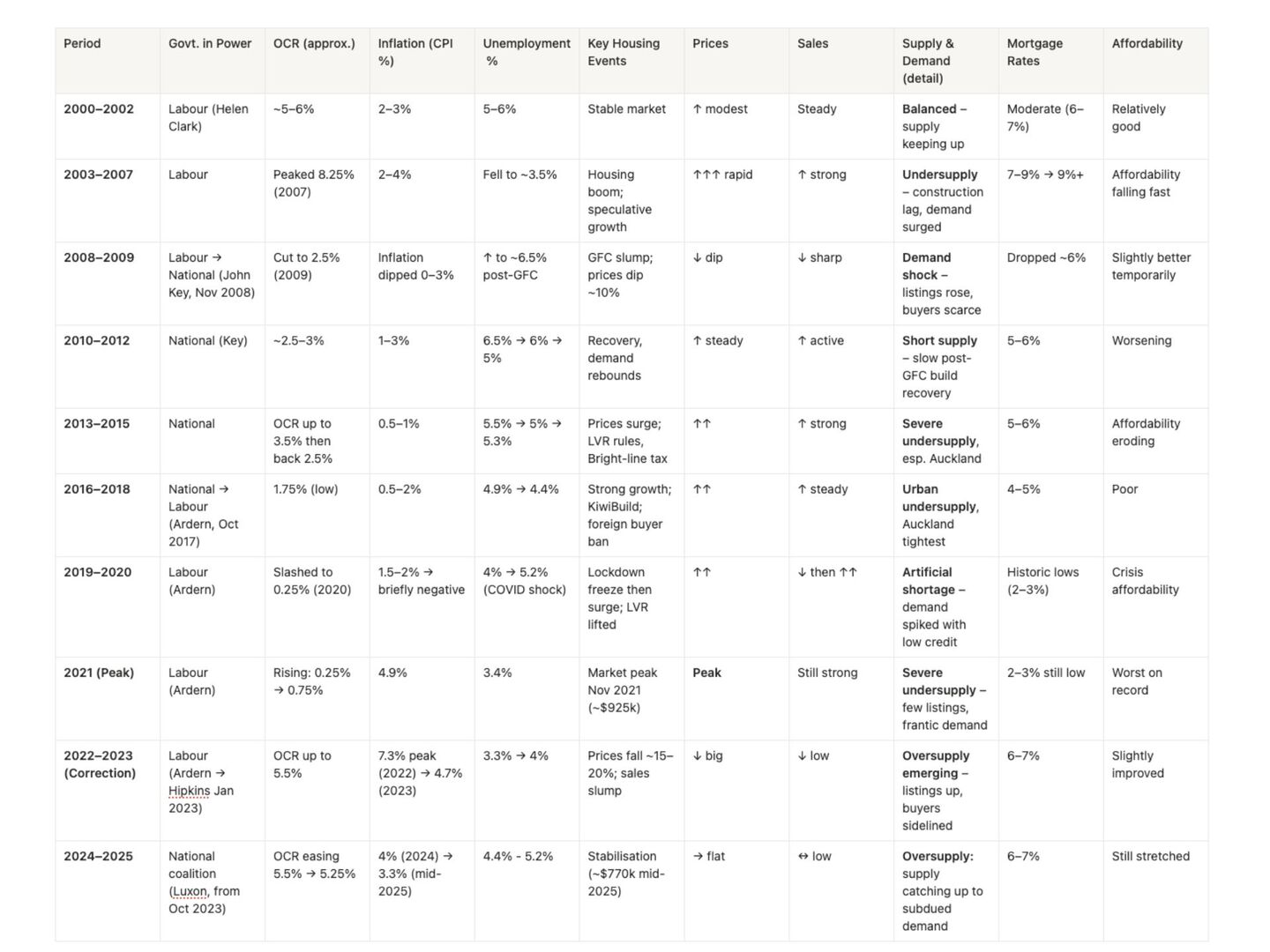 Early 2000s: OCR ~5–6%, inflation 2–3% → relatively stable market.