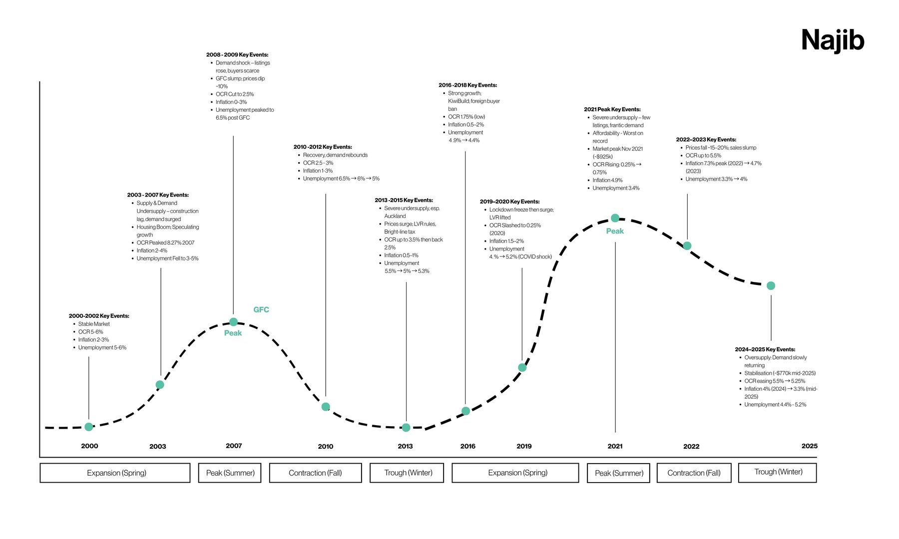 2007–2009 (GFC): Peak then sharp contraction; OCR cut to ~2.5% to stimulate.